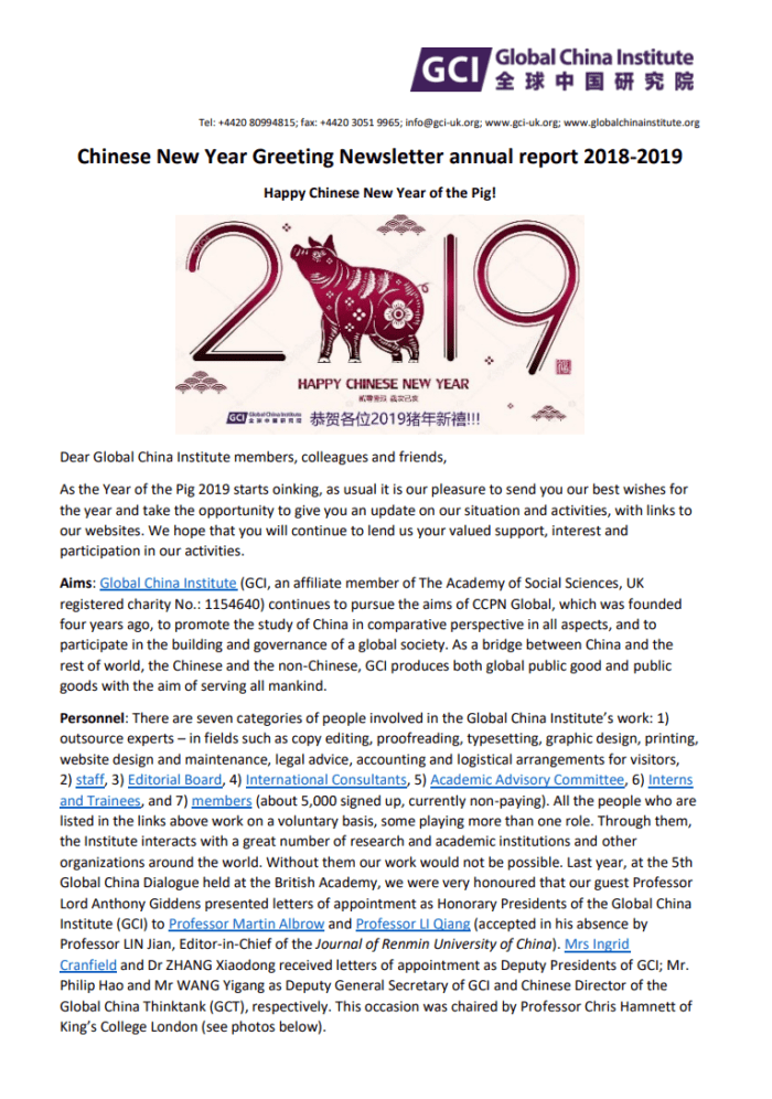 Chinese New Year Greeting Newsletter / GCI Annual Report (2018–2019)