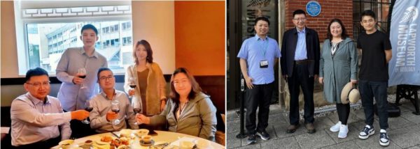 Left Photo: President Wang Shubin of the British Avenue Consulting Group with his colleagues (middle front row and back row) hosted a Cantonese meal for Professors Zhao and Yuan at Chung Ying Cantonese Restaurant, ranked third among the best Chinese restaurants in Birmingham. Right Photo (from left to right): Dr Yongjian Li, Prof ZHAO Kejin, Ms YUAN Lijuan and Dr Mengda WU in front of a blue plaque commemorating Professor Li Siguang at the University of Birmingham.