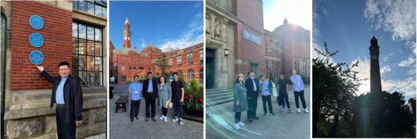 Photo 1(from left to right): Above the commemorative plaque for Professor Li Siguang pointed out by Professor Zhao Kejin, from top to bottom, are plaques for Charles Lapworth (1882-1923, pioneering work on mountain range formation), Frederick Shotton (1949-1974, advancing understanding of climate change), and Professor Li Siguang (1889-1971, geologist and politician, made pioneering contributions to Chinese geology and natural resource research, received a doctorate from the University of Birmingham in 1927). Photo 2: Chris and Maggie with Professors Zhao and Yuan in front of the Joseph Chamberlain Memorial Clock Tower (Old Joe) at the University of Birmingham’s Edgbaston Campus, showcasing the university’s history and neoclassical architectural style. Photos 3 and 4 (from left to right): Ms YUAN Lijuan, Prof ZHAO Kejin, Dr Yongjian Li, Dr Mengda Wu and Dr Deqing Rong of Birmingham University looking up at the clock tower.
