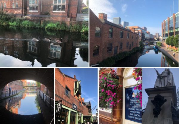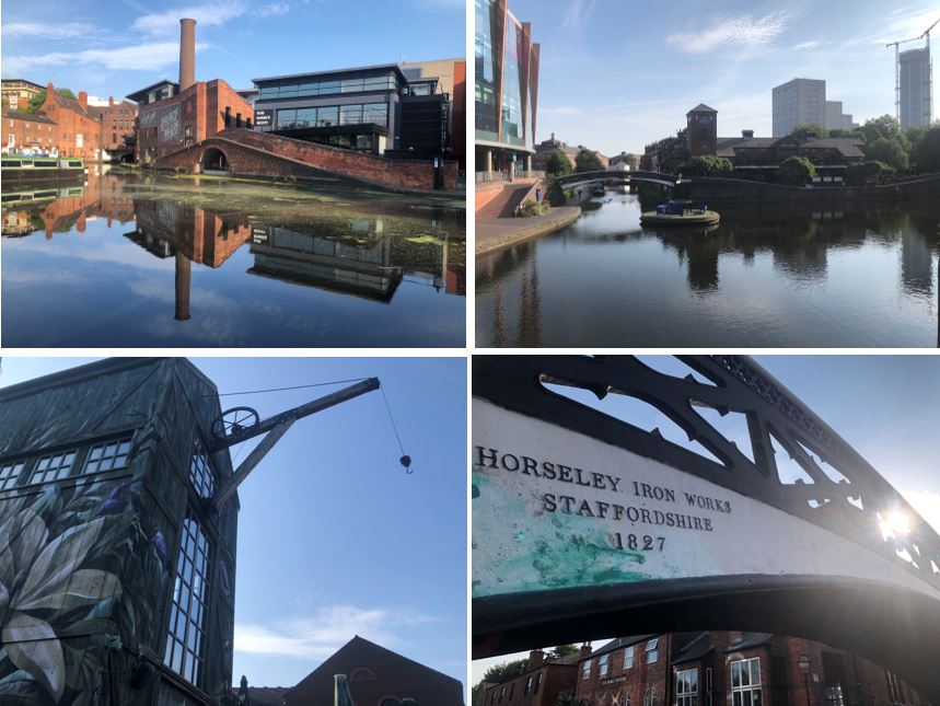 Top Left Photo: This is a view of the canal area in central Birmingham, featuring historical landmarks such as ‘Regency Wharf’ and ‘Rum Runner Works,’ part of the city’s extensive canal network. The photo shows the coexistence of red brick buildings and modern architecture, highlighting the blend of old and new in this area. Top Right Photo: This is Brindley place and its surrounding areas in central Birmingham, known for its beautiful canal scenery, historical buildings, and modern facilities. The modern buildings on the left contrast with the historical buildings on the right, with high-rise buildings and bridges over the canal adding layers to the cityscape, showcasing the city’s diverse development and vibrant urban character. Bottom Left Photo: This is a building in Birmingham’s canal area, with an old crane and pulley system on top, once used for canal cargo loading and unloading, symbolizing the canal trade and industrial activity of the past. The large mural depicting plants on its exterior wall combines industrial, artistic, and historical elements of the canal area. Bottom Right Photo: This is an iron bridge in Birmingham’s canal area, manufactured in 1827 by the Horseley Iron Works in Staffordshire, known for high-quality iron products. The bridge showcases 19th-century industrial technology and design, reflecting the engineering and manufacturing achievements of the British Industrial Revolution.