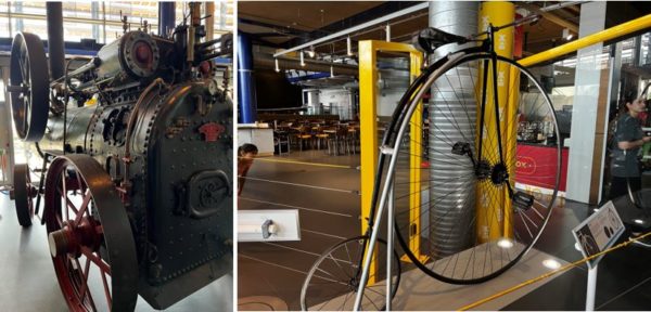 These two photos were taken at Birmingham’s Thinktank Science Museum, located at Millennium Point, an interactive science museum showcasing various exhibits from the Industrial Revolution to modern technology. Left Photo: This is an ancient steam locomotive, demonstrating the complexity and aesthetics of mechanical manufacturing during the Industrial Revolution. The design includes large drive wheels, a complex piping system, and various valves and instruments. Its working principle involves burning coal or wood to heat water, generating steam whose pressure drives pistons, which in turn rotate the wheels, showcasing the engineering achievements and technological progress of the steam power era. Steam locomotives were widely used in industrial and transportation fields in the 19th and early 20th centuries, propelling the progress of the Industrial Revolution. Right Photo: This is a high-wheeled bicycle (Penny-farthing) that was very popular in the late 19th century. The design aimed to increase riding speed since a larger front wheel could cover more distance per rotation. However, due to its instability and tendency to cause falls, it was later replaced by safer and more practical modern bicycles.