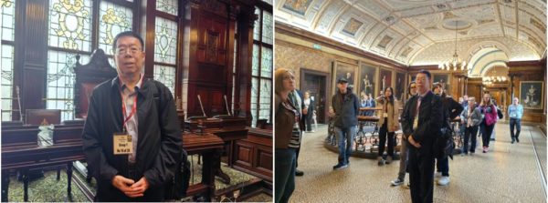 以下照片展示了朱校长参观格拉斯哥市政厅的情景。左边的照片是在一个会议室或议事厅,华丽的木质装饰风格体现了维多利亚时期对细节的关注,雕刻精美,代表了当时的建筑风格和工艺水平。彩绘玻璃窗是格拉斯哥市政厅内部的一大特色,这些玻璃描绘了象征性图案或城市徽章,展示了格拉斯哥的历史和文化。右边的照片中,天花板上的雕刻和绘画十分精美,许多地方使用了大理石和金箔装饰,展现出当时市政府的权威和富裕;大型的历史油画以及复杂的铁艺栏杆,这些元素体现了市政厅作为城市权力象征的重要性。市政厅作为城市的象征,反映了格拉斯哥在不同时期的历史文化发展和社会变迁。