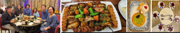 8月8日晚上7点多,我来到位于Willesden Green的朱校长下榻的旅店,欢迎他们全家。感谢朱校长的体贴,这里的邮编是NW2,与学术院的院士之家(NW7)只有不到20分钟的车程,在偌大的伦敦几乎可以说是近邻了!基于中国知识分子传统的“破万卷书、行万里路”理念,我们加了两句“食国际餐、交四方友”,并选择了他们驻地附近的一家土耳其餐馆来接待他们。这家Lezziz Charcoal Grill餐馆内部装饰简约,但氛围温馨,提供正宗的土耳其烤肉和丰富的地中海美食。以下照片左上为我们的“大家庭照”(自左至右):朱校长的儿子、儿媳、夫人、孙女、他本人和我;在享用完丰富的地中海沙拉后,上来的烧烤大餐相当于左下图中的两倍,之后的甜食和茶也都挺别致。席间,我们讨论了中餐与土耳其餐从形式到内容的区别,欣赏对他们这种“美人之美”和“美美与共”的态度。朱校长说,英国的餐厅比国内的热闹,餐后回来的路上,我注意到不少餐厅也挺冷清的,说明我的选择还不错,大家也挺满意。我认为,出国时间宝贵,穿衣除外,食住行都应该是与在国内不同的体验。