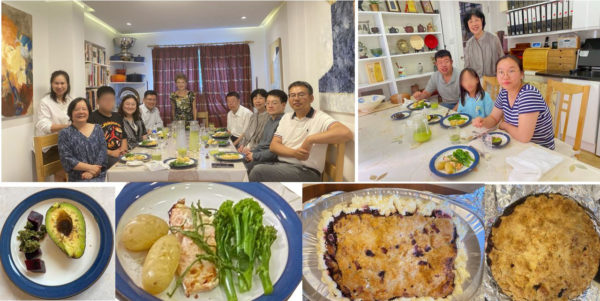 晚宴为西餐,分别在两个餐厅举行:10人在主餐厅,朱校长的儿子一家三口在花园房餐厅(见下图上排左右)。事后才意识到,这三道菜是意大利、法国和英国风味的组合。