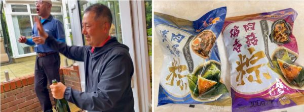 Left: Kai Liang hosted the Champagne Reception and Tao Liu opened a bottle of Champagne. Right: different varieties of Zongzi dumplings.
