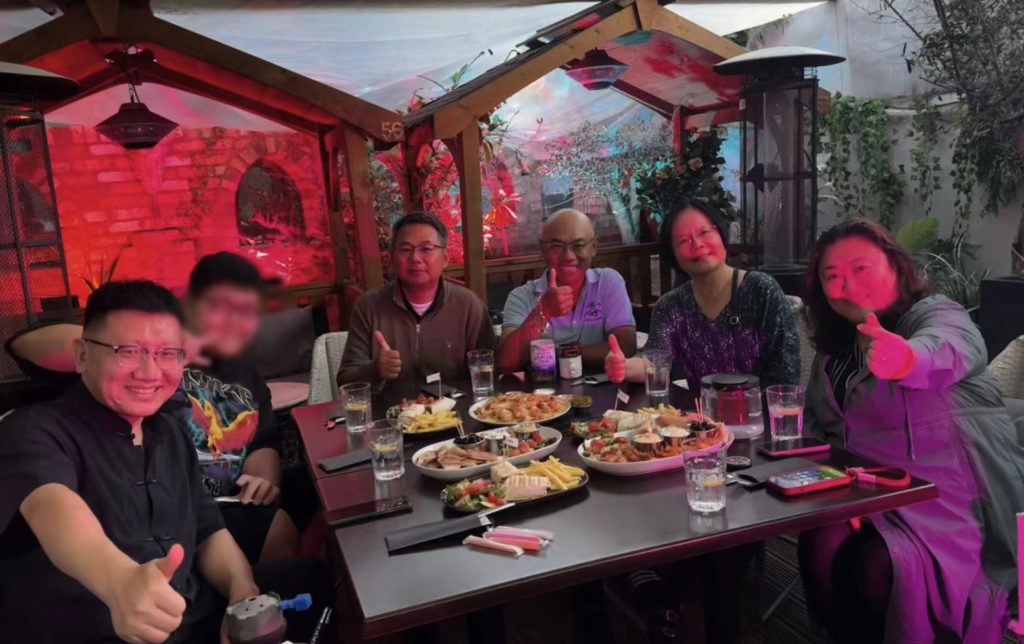 7月27日,伦敦(一)。学术院负责活动的官员梁凯在伦敦希思罗机场 (T2) 于17:45迎接了赵可金教授及其夫人和儿子。由于出关延误,他们于20:30才抵达The Madonna Halley Hotel的The Shisha Garden。这是一家希腊风格的花园餐厅,其环境充满了异国情调,装饰着茂密的植被和精心设计的灯光,营造出一种神秘而迷幻的氛围。学术院后勤经理刘大卫和我在此为他们设宴接风。