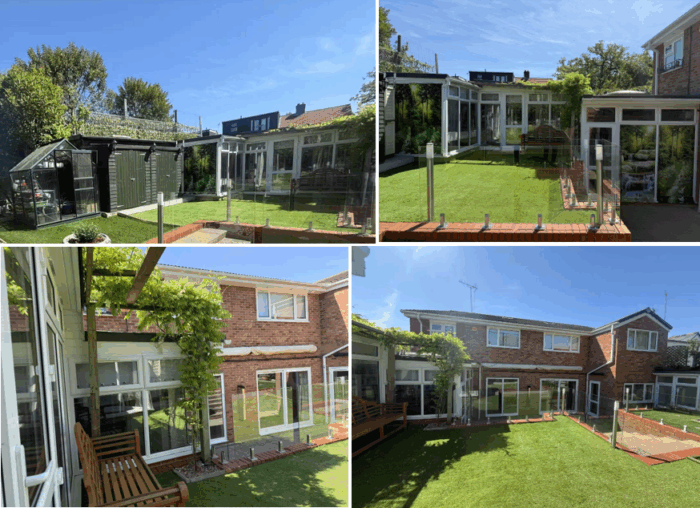 On the right, the U-shape sunroom, wisteria, and wooden bench form a gentle enclosure. Inside the sunroom are books, thoughts, and collections— an extension of spirit, a vessel for emotion.