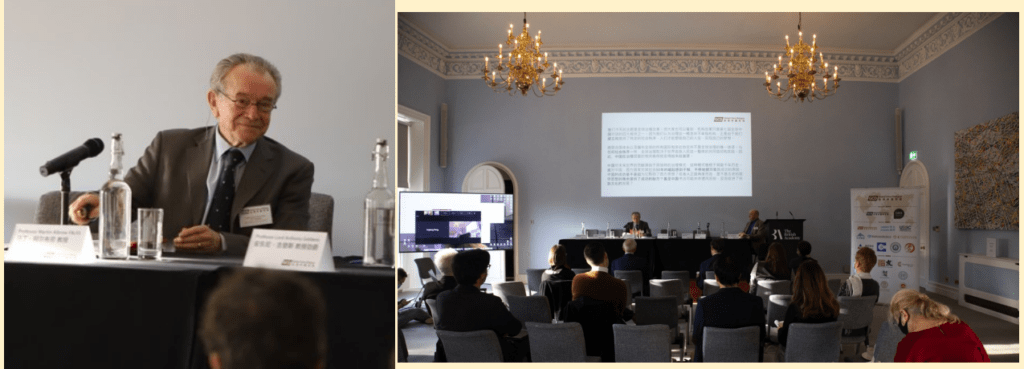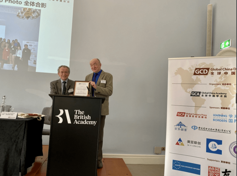 Presenting the certificate of Appreciation to retired Honorary President Professor Martin Albrow Presented by Professor Tony McEnery FAcSS, FRSA Council Member, Academy of Social Sciences; Distinguished Professor of English Language and Linguistics at Lancaster University; Chair of Global China Academy Council and Founding Fellow.