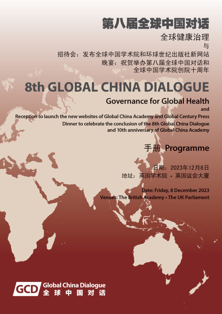 在全球中国学术院成立10周年(2013-2023)之际,我们迎来了第八届全球中国对话论坛——“全球健康治理”。对话将于12月8日在英国学术院举行,招待会和晚宴将在英国议会的上议院举办。在此,我们代表组委会邀请您参加第八届全球中国对话论坛及庆典晚宴。对话和晚宴均提供免费注册选项,请在本通知后面查看相关信息,更新的信息将在这里及时更新。